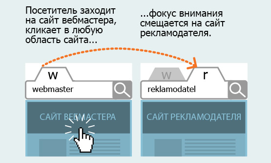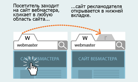 ClickUnder — популярный формат привлечения трафика на сайт. Сайт рекламодателя открывается в новой вкладке — в фоновом режиме — при первом клике на любую область страницы вебмастера.